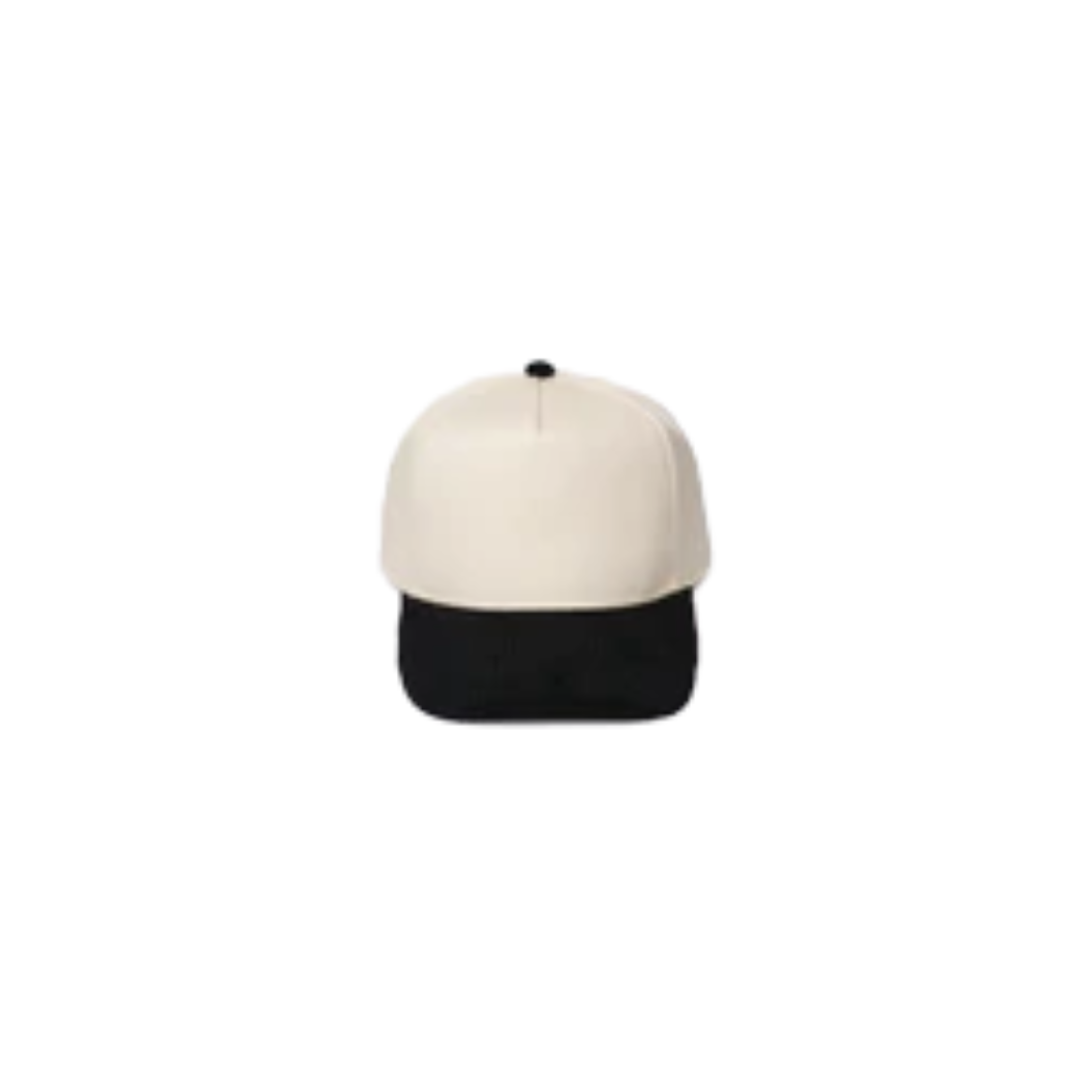 Turn heads with this chic two-tone baseball cap, featuring a sleek cream crown paired with a black corduroy brim. The perfect mix of classic and trendy, this one-size-fits-most design delivers all-day comfort and standout style. Wear it solo for a fashion-forward edge or customize it with our patches to make it uniquely yours.