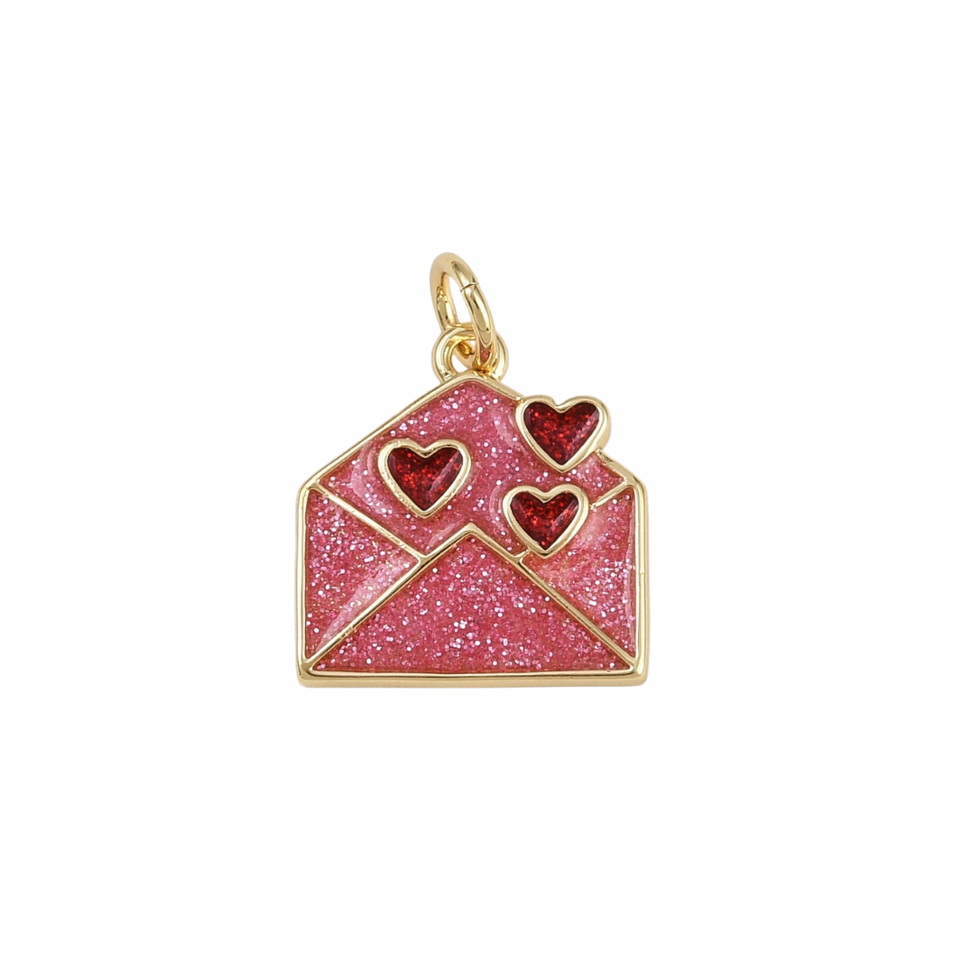 Deliver a little sparkle and a lot of love with the Gold Glitter Heart Mail Charm. Shimmering with pink glitter and filled with radiant red hearts, this playful envelope charm is a sweet symbol of affection, joy, and heartfelt connection. Add it to a necklace or bracelet to carry love wherever you go—or gift it as a charming reminder that the best messages come straight from the heart.