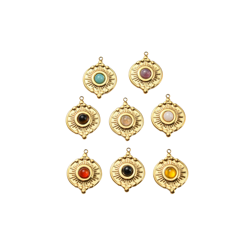 Bask in radiant energy. The Gold Sunstone Harmony Charm features a glowing cabochon set at the center of a golden sunburst medallion, symbolizing warmth, balance, and inner light. Its vibrant color and intricate detailing make it a standout piece—earthy, elegant, and full of celestial charm.